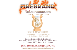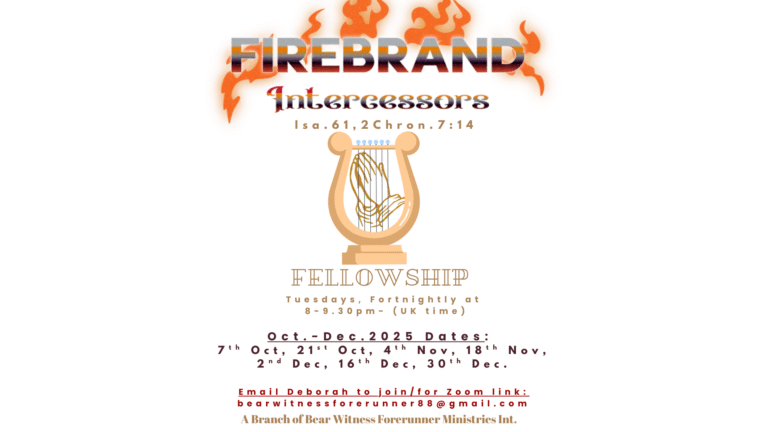 Called to corporate intercessory prayer? Then do not hesitate to join our new Firebrand Intercessory Prayer Fellowship on Zoom, starting on 7th Oct. 8pm-9.30pm (UK time). Fill in the form in the top menu. Please invite your intercessor friends to join.
